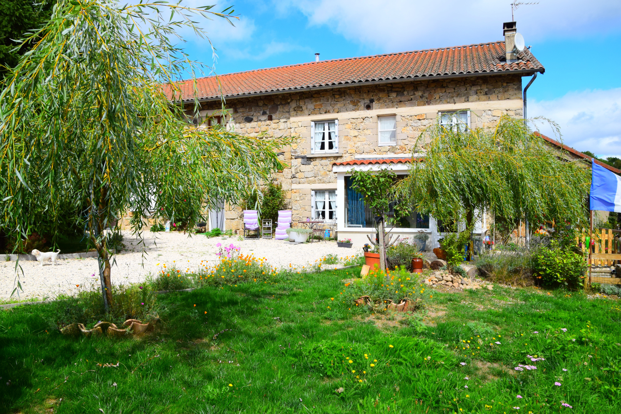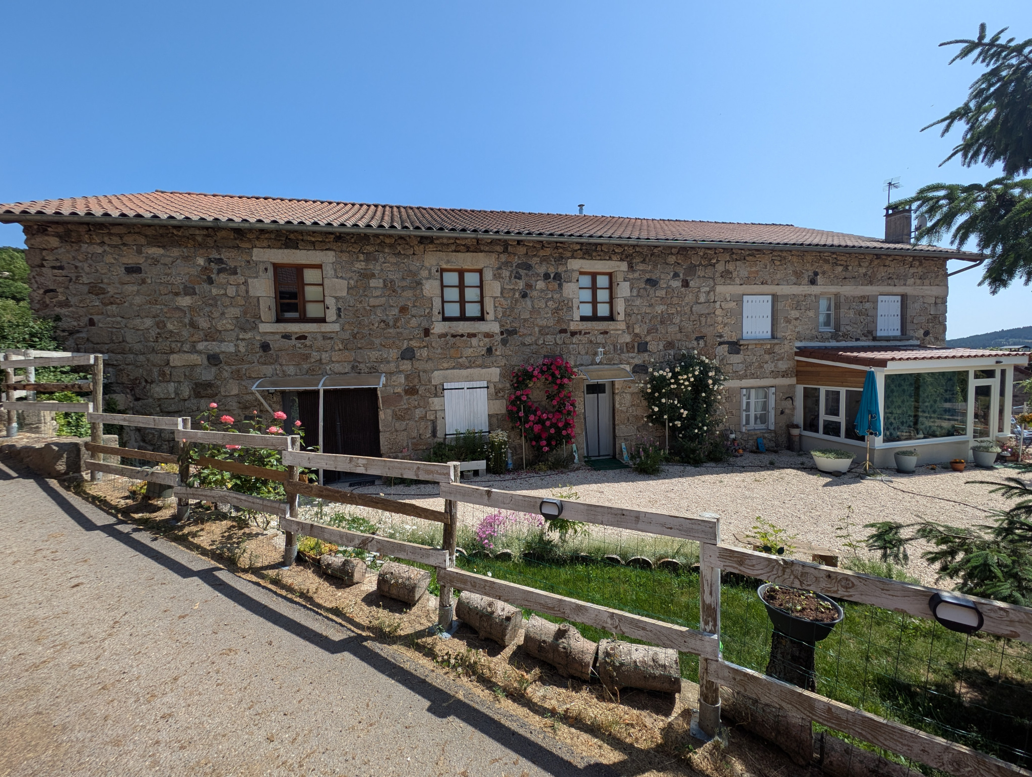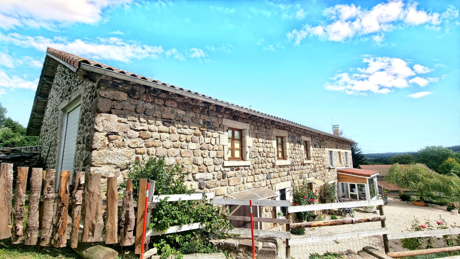 La ferme est construite sur une parcelle de 2.300 m². Vous pourrez profiter d’un bel extérieur en gravier blanc côté Sud-Ouest, ou d’une vaste cour arborée et fleurie, ainsi que d’un magnifique potager côté Nord-Est.