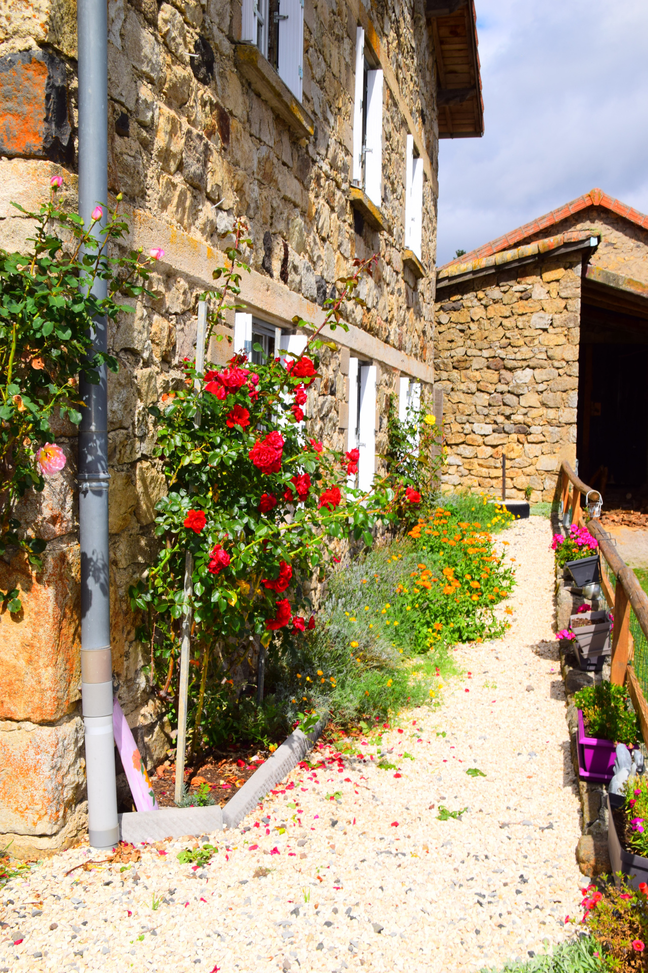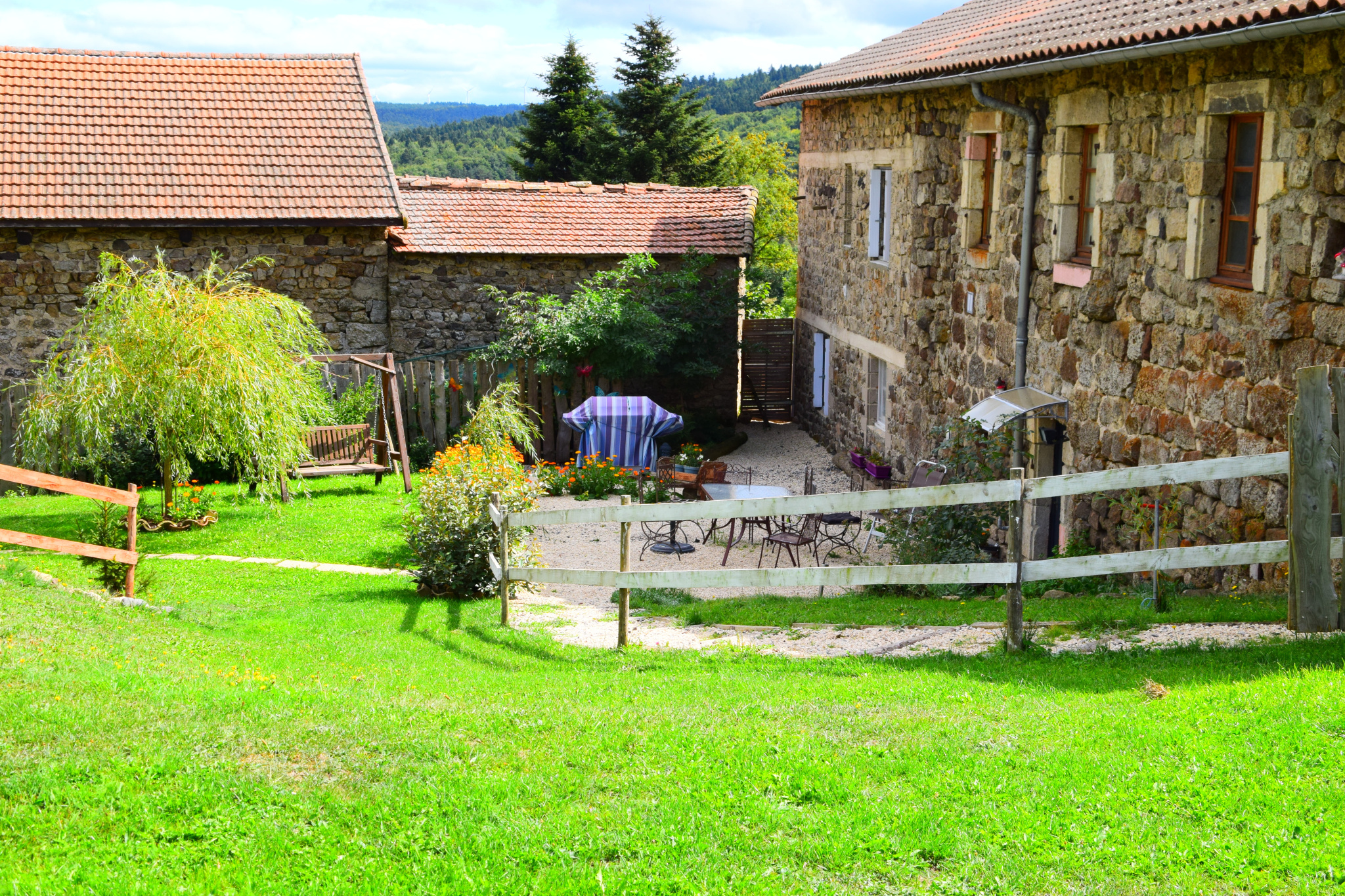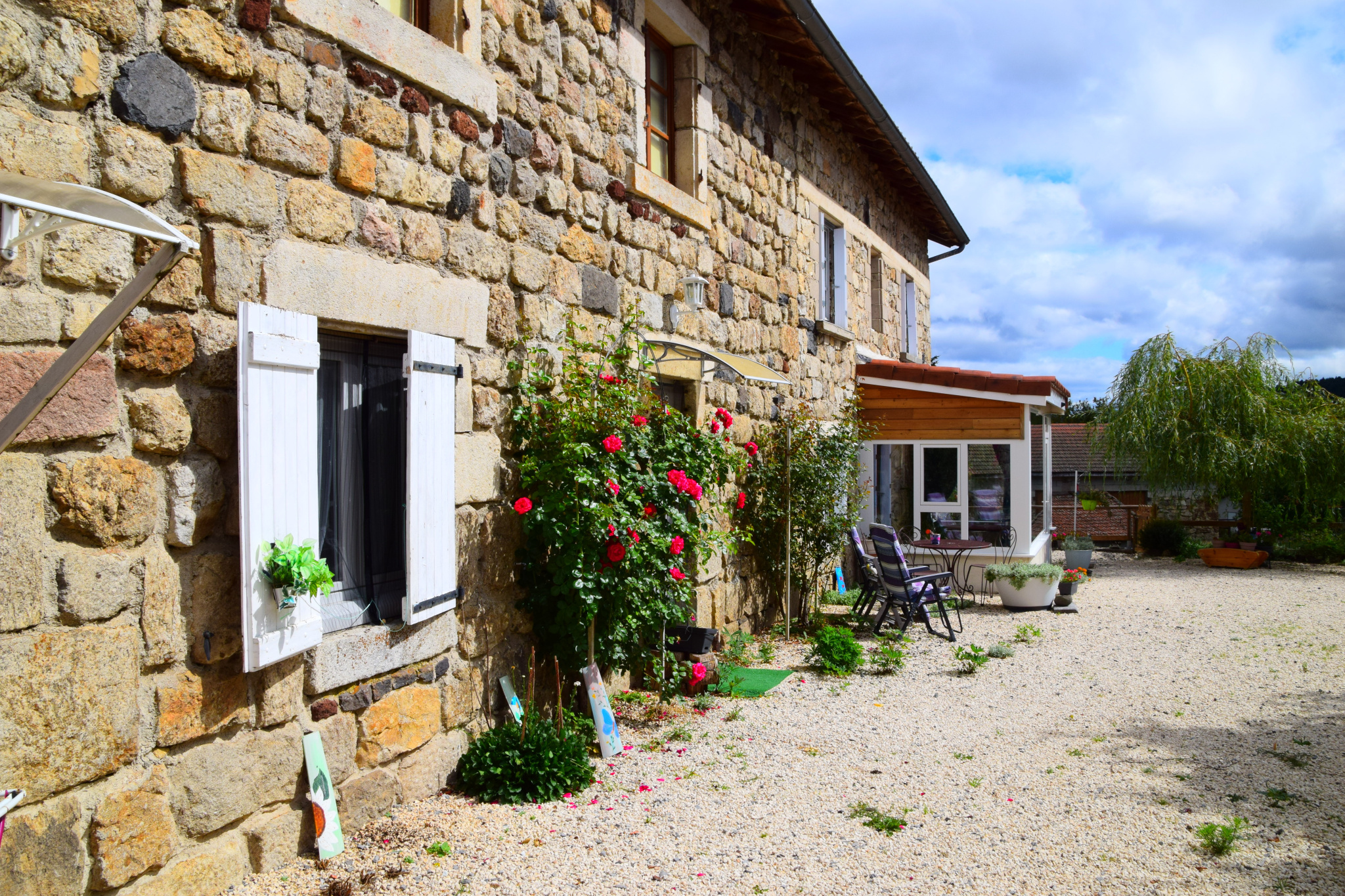 La ferme est construite sur une parcelle de 2.300 m². Vous pourrez profiter d’un bel extérieur en gravier blanc côté Sud-Ouest, ou d’une vaste cour arborée et fleurie, ainsi que d’un magnifique potager côté Nord-Est.