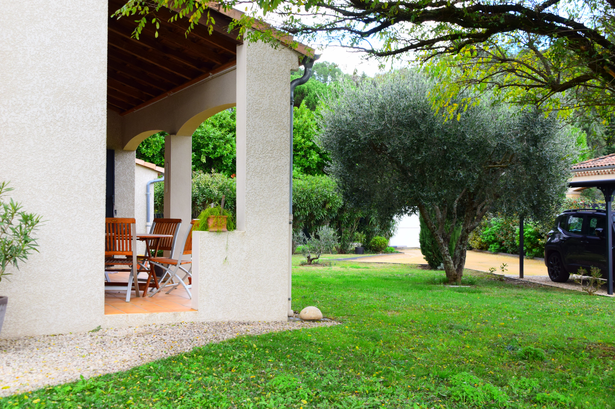 Une petite allée gravillonnée vous dirige vers le porche d’entrée.